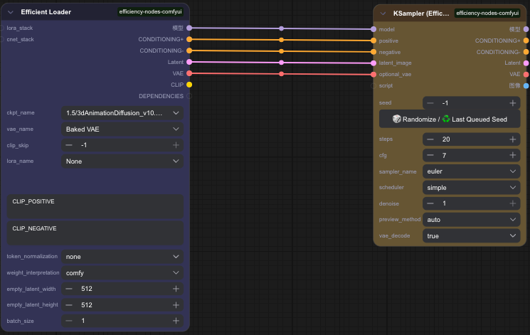 - Add "Efficiency Loader" (set model/VAE/prompts) + "K Sampler (Efficiency)" (keep default).