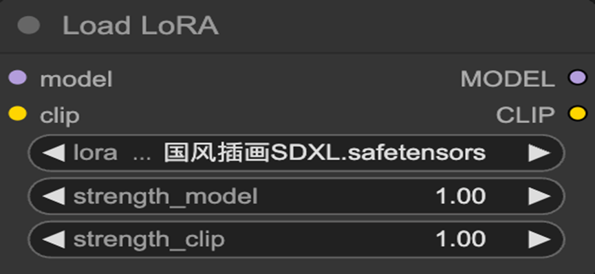 The "Load LoRA "node is used to load LoRA models and configure model weights. Its input and output ports are "Model" and "CLIP".