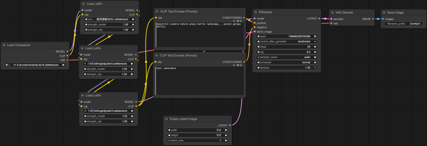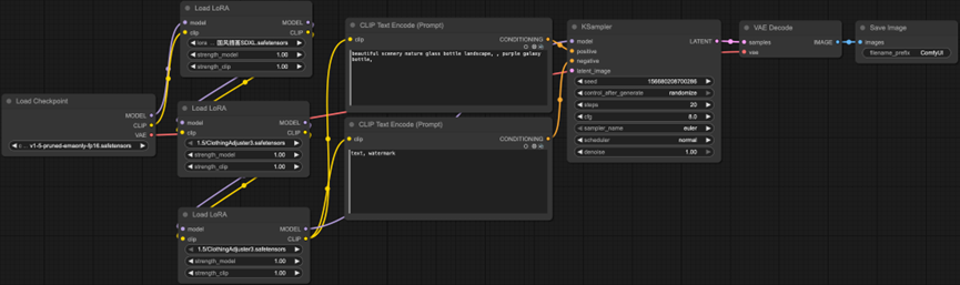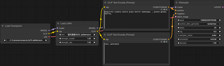 At this point, a complete text-to-image workflow with Load LoRA node is successfully built! Your node network should form a logical data flow chain.